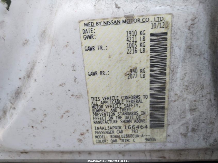 2013 NISSAN ALTIMA - 1N4AL3APXDC166464, цвет - Белый, 2.5, Бензин, Передний привод из США