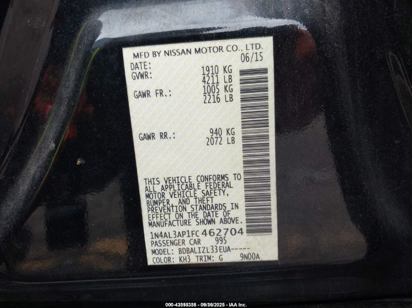 2015 NISSAN ALTIMA - 1N4AL3AP1FC462704, цвет - Черный, 2.5, Бензин, Передний привод из США