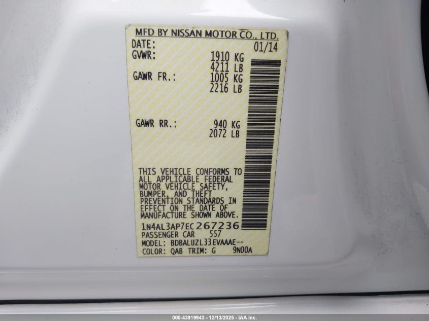 2014 NISSAN ALTIMA - 1N4AL3AP7EC267236, цвет - Белый, 2.5, Бензин, Передний привод из США