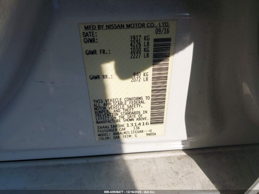 2017 NISSAN ALTIMA - 1N4AL3AP3HC131416, цвет - Белый, 2.5, Бензин, Передний привод из США