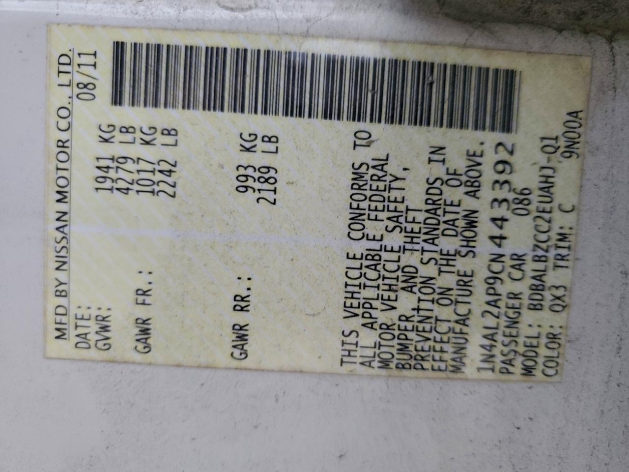 Цвет БелыйЦилиндры 4VIN 1N4AL2AP9CN443392Состояние Заводится и едет (проверено)Повреждения Задняя