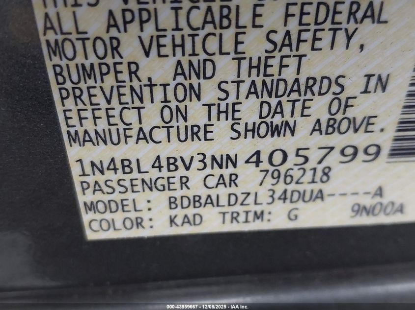 Цвет СерыйЦилиндры 4Привод Передний приводVIN 1N4BL4BV3NN405799Состояние Заводится и едет (проверено)Повреждения Передняя или задняя