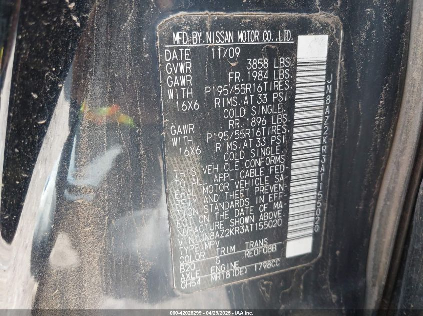 2010 NISSAN CUBE - JN8AZ2KR3AT155020, цвет - Черный, 1.8, Бензин, Передний привод из США