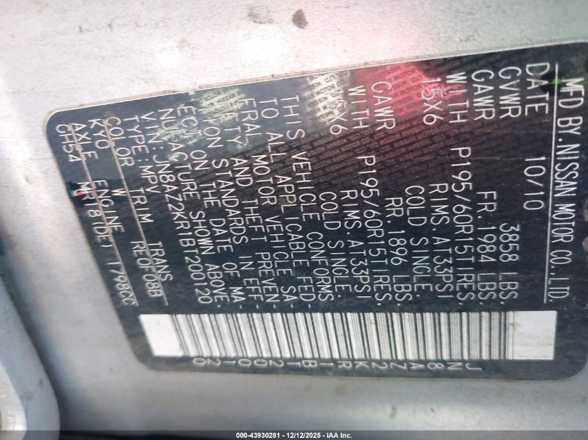 2011 NISSAN CUBE - JN8AZ2KR1BT200120, цвет - Серебряный, 1.8, Бензин, Передний привод из США