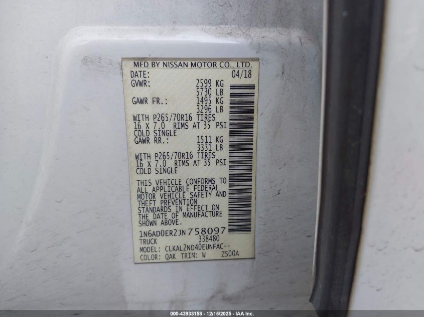 2018 NISSAN FRONTIER - 1N6AD0ER2JN758097, цвет - Белый, 4.0, Бензин, из США