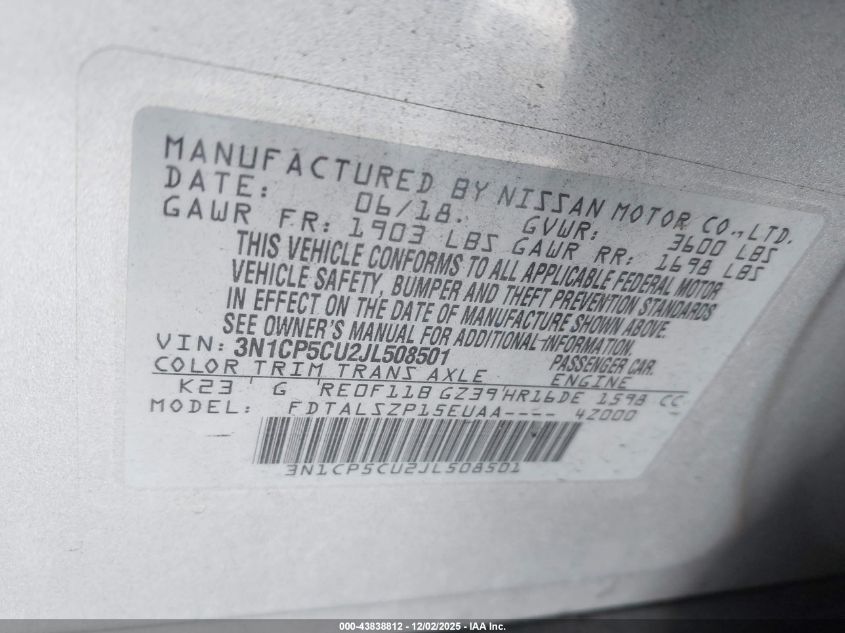 2018 NISSAN KICKS - 3N1CP5CU2JL508501, цвет - Серебряный, 1.6, Бензин, Передний привод из США
