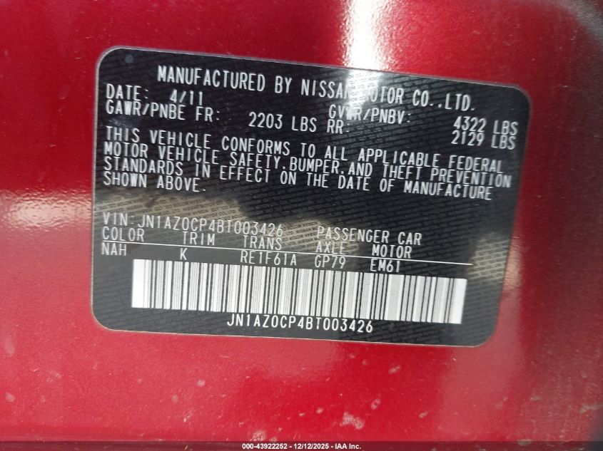 Цвет БургундияПривод Передний приводVIN JN1AZ0CP4BT003426Состояние Заводится и едет (проверено)Повреждения Задняя