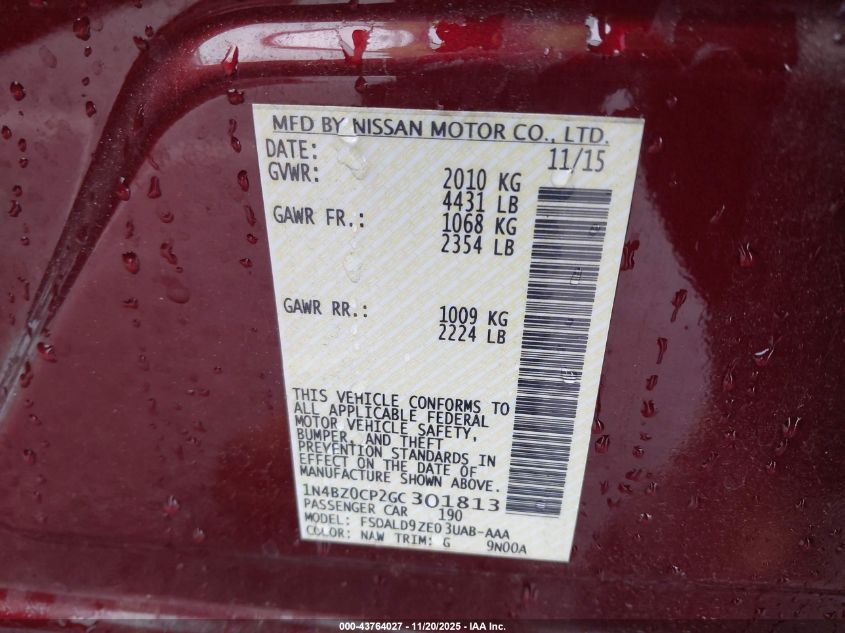 Цвет КрасныйПривод Передний приводVIN 1N4BZ0CP2GC301813Состояние НеизвестноПовреждения Передняя или задняяДата аукциона 2025-12-18