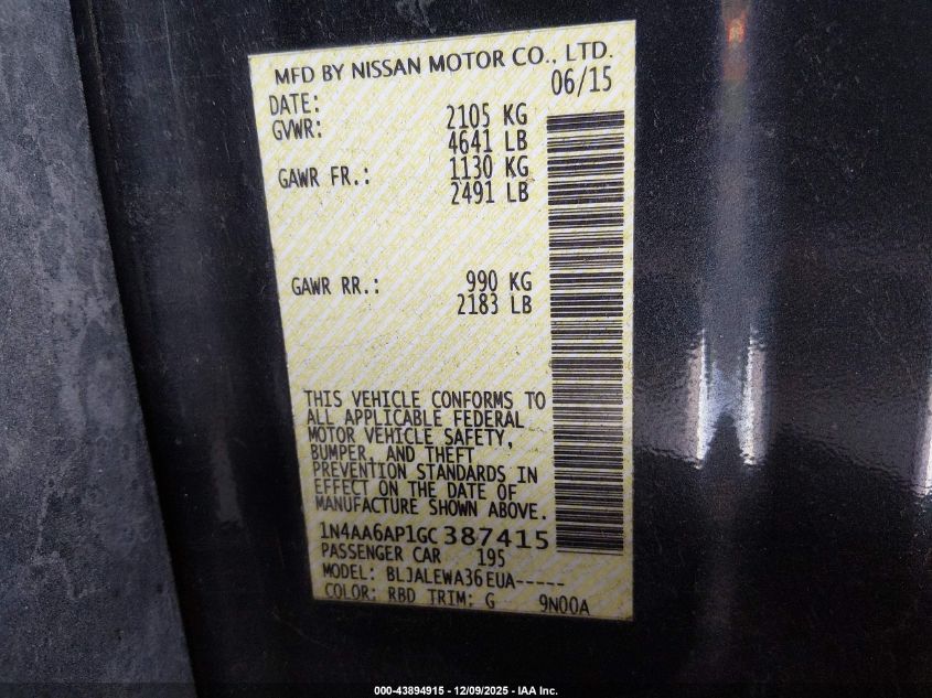 2016 NISSAN MAXIMA - 1N4AA6AP1GC387415, цвет - Черный, 3.5, Бензин, Передний привод из США
