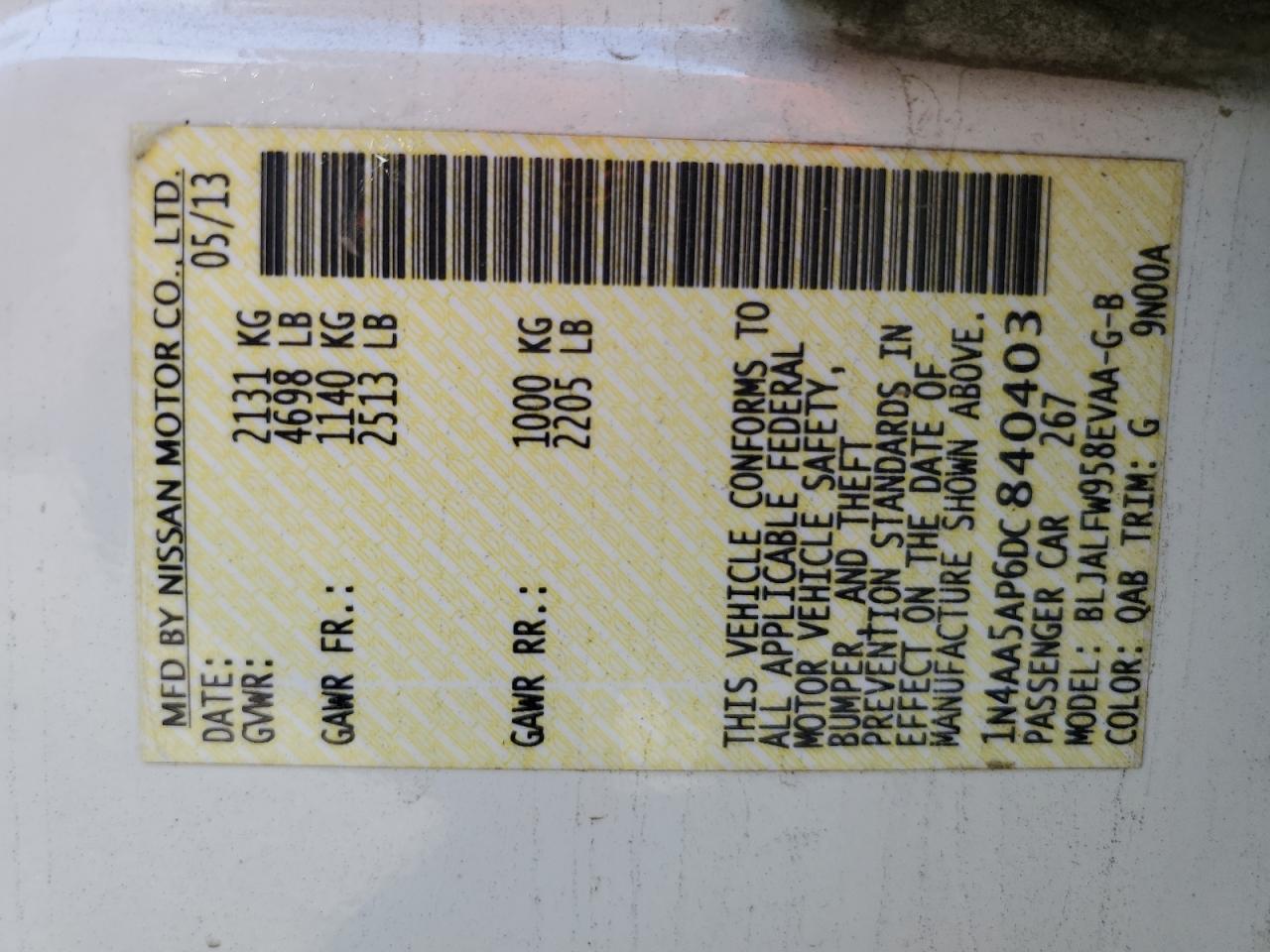 Цвет БелыйЦилиндры 6VIN 1N4AA5AP6DC840403Состояние Заводится и едет (проверено)Повреждения НезначительныеДата аукциона 2025-10-07