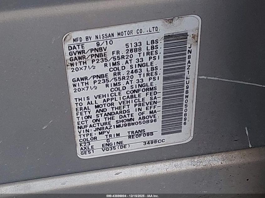 2011 NISSAN MURANO - JN8AZ1MU9BW050896, цвет - , 3.5, Бензин, Передний привод из США