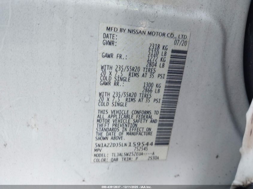 Цвет БелыйЦилиндры 6Привод Передний приводVIN 5N1AZ2DJ5LN159544Состояние СтационарноПовреждения Опрокидывание