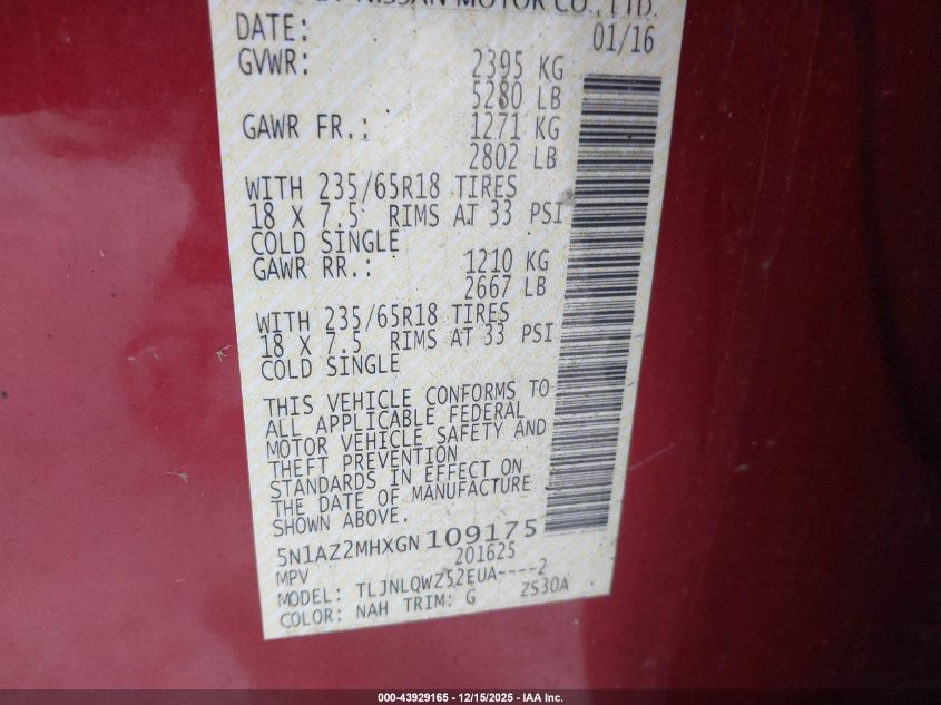 Цвет КрасныйЦилиндры 6Привод Полный приводVIN 5N1AZ2MHXGN109175Состояние СтационарноПовреждения Передняя левая