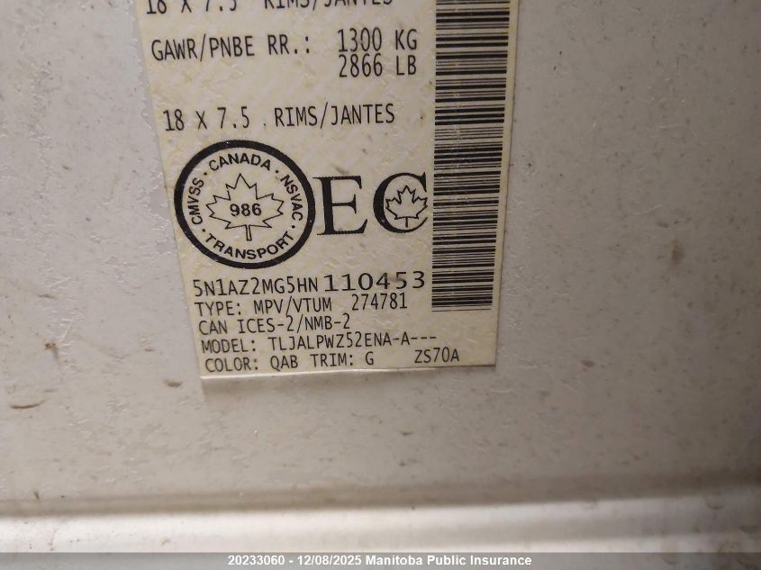 Цвет БелыйЦилиндры 6Привод Передний приводVIN 5N1AZ2MG5HN110453Состояние СтационарноПовреждения Правая сторонаДата аукциона 2025-12-17