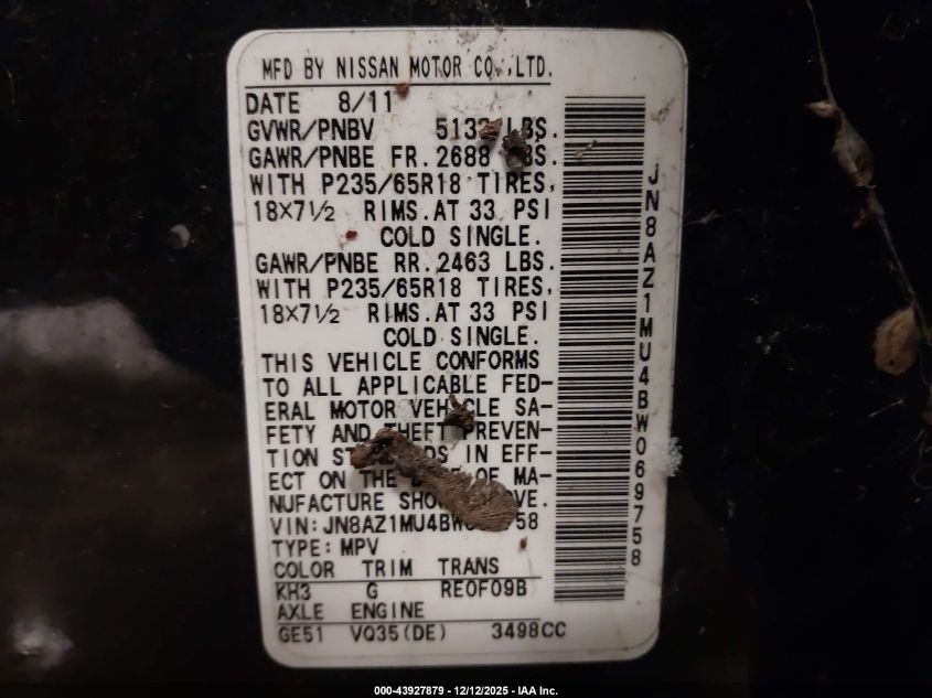 2011 NISSAN MURANO - JN8AZ1MU4BW069758, цвет - Черный, 3.5, Бензин, Передний привод из США