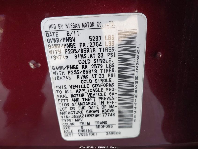2011 NISSAN MURANO - JN8AZ1MW2BW177748, цвет - Красный, 3.5, Бензин, Полный привод из США