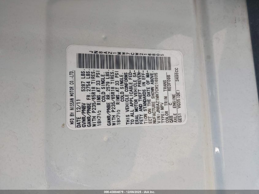 2012 NISSAN MURANO - JN8AZ1MW7CW216805, цвет - Белый, 3.5, Бензин, Полный привод из США