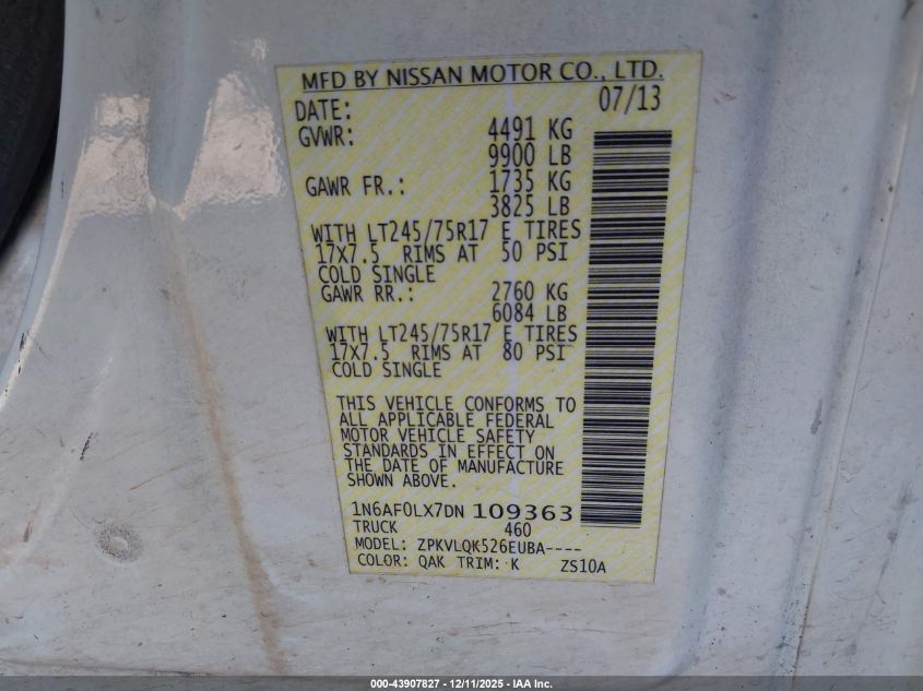 Цвет БелыйЦилиндры 8Привод Задний приводVIN 1N6AF0LX7DN109363Состояние СтационарноПовреждения Био/Химические