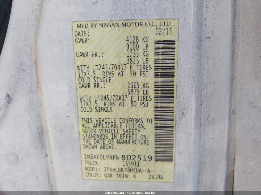 2015 NISSAN NV CARGO - 1N6AF0LYXFN802519, цвет - Белый, 5.6, Бензин, Задний привод из США
