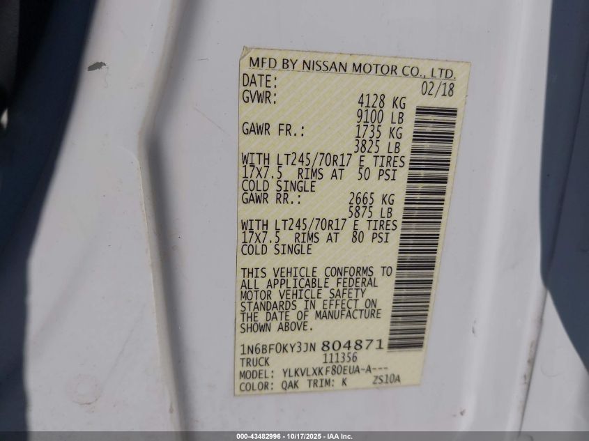 2018 NISSAN NV CARGO - 1N6BF0KY3JN804871, цвет - Белый, 4.0, Бензин, Задний привод из США