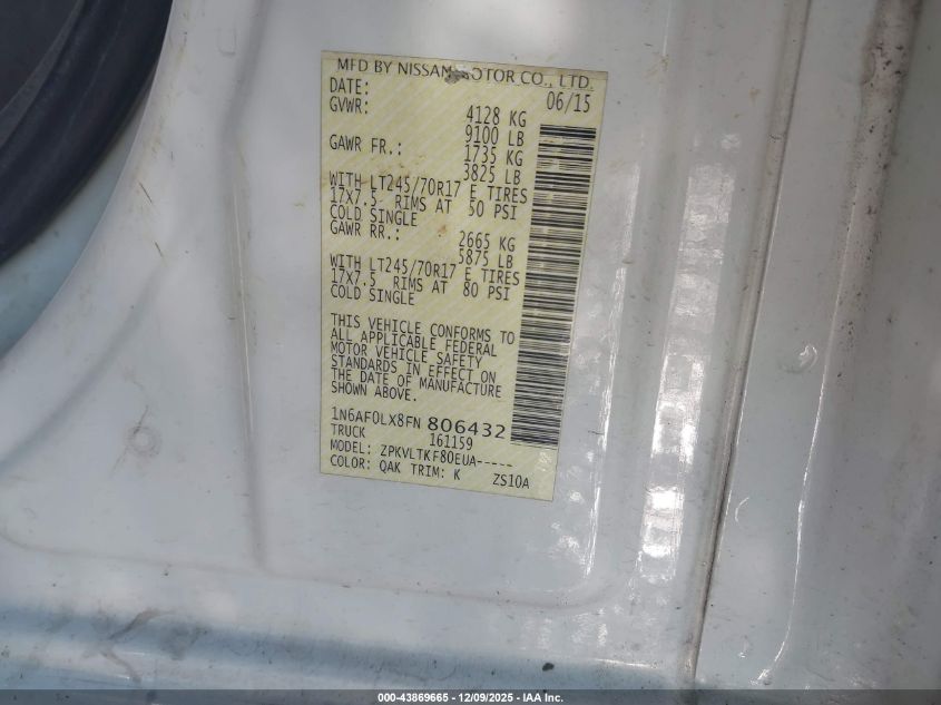 Цвет БелыйЦилиндры 8Привод Задний приводVIN 1N6AF0LX8FN806432Состояние Заводится и едет (проверено)Повреждения Передняя и задняя