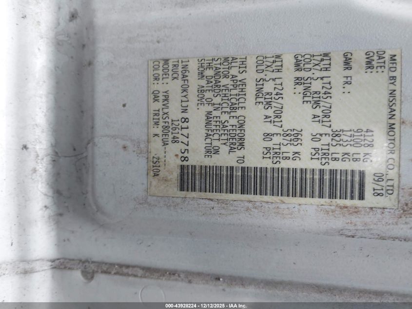 Цвет БелыйЦилиндры 8Привод Задний приводVIN 1N6AF0KY1JN817758Состояние СтационарноПовреждения Обычный износДата аукциона 2025-12-18