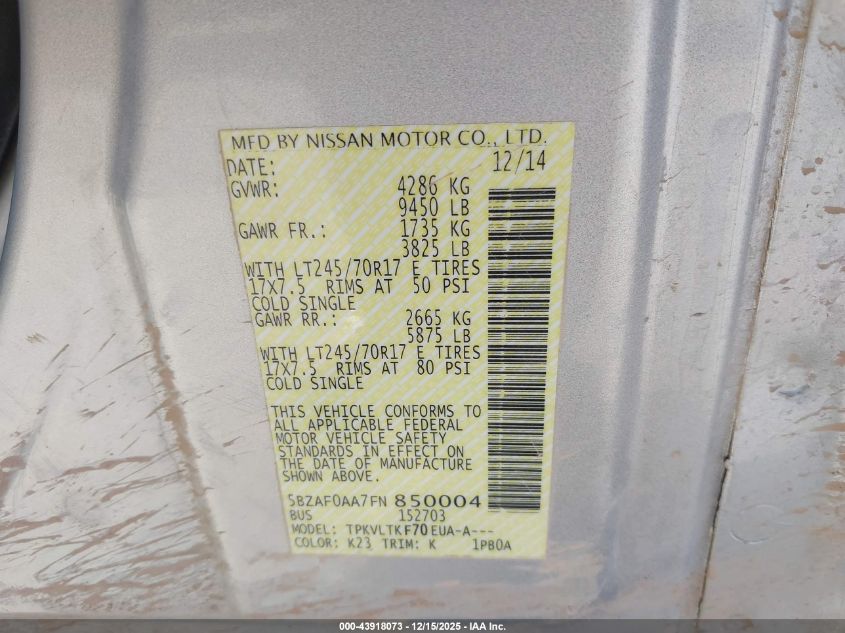2015 NISSAN NV3500 - 5BZAF0AA7FN850004, цвет - Серебряный, 5.6, Бензин, Задний привод из США