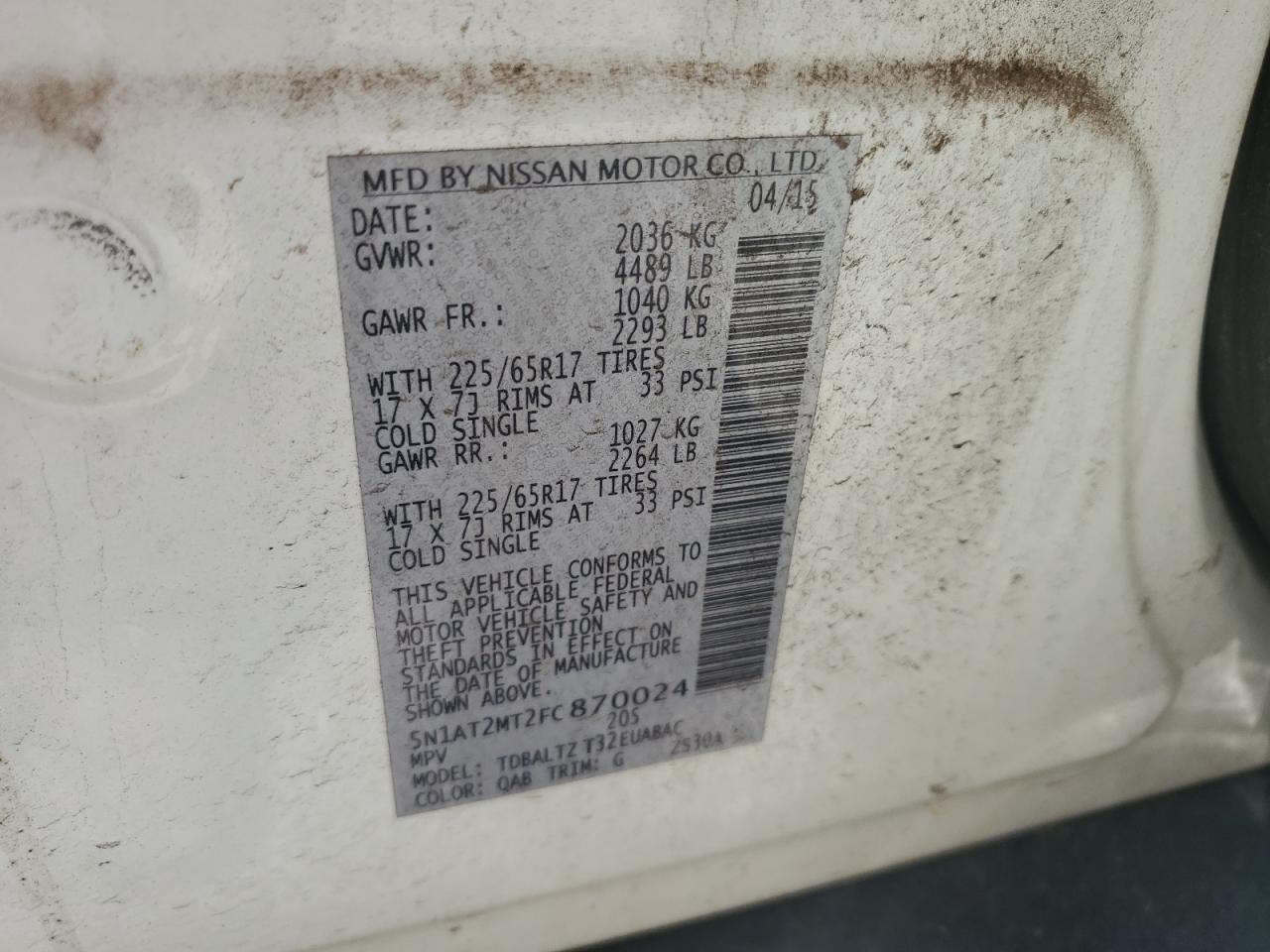 2015 NISSAN ROGUE - 5N1AT2MT2FC870024, цвет - Белый, 2.5, Бензин, из США