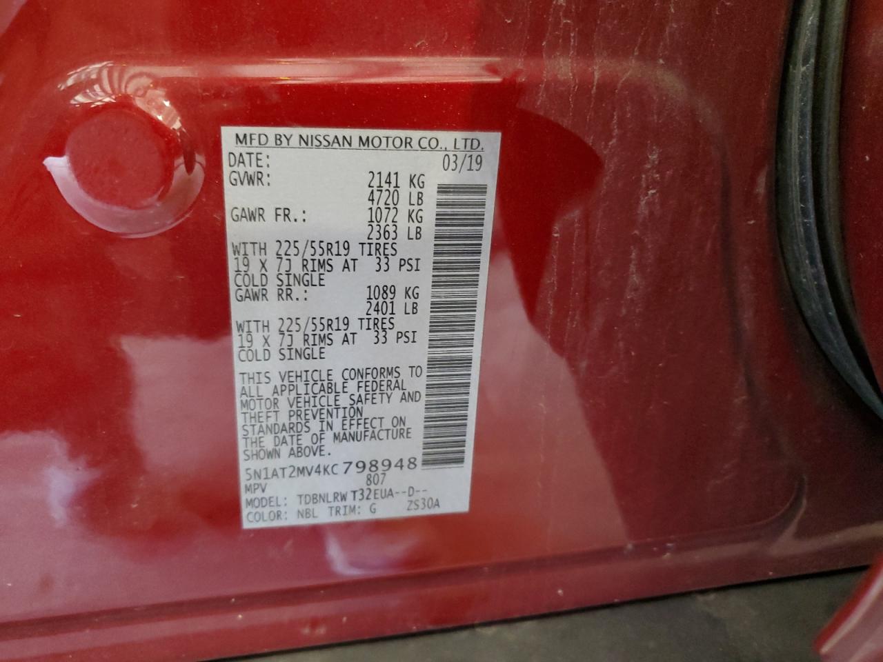 2019 NISSAN ROGUE - 5N1AT2MV4KC798948, цвет - Красный, 2.5, Бензин, Полный привод из США