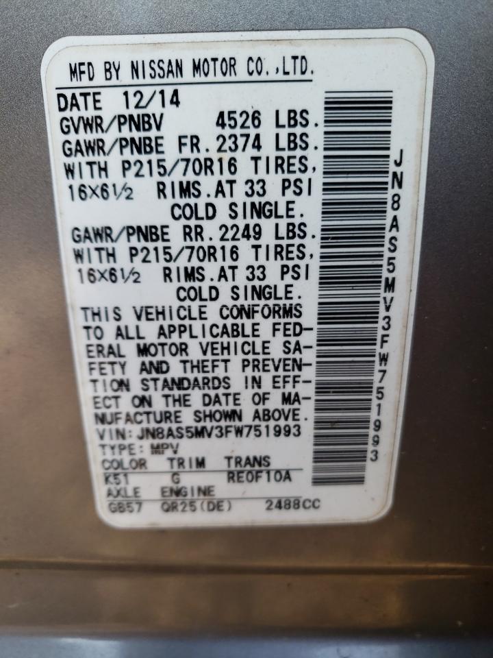 2015 NISSAN ROGUE - JN8AS5MV3FW751993, цвет - Серый, 2.5, Бензин, Полный привод из США