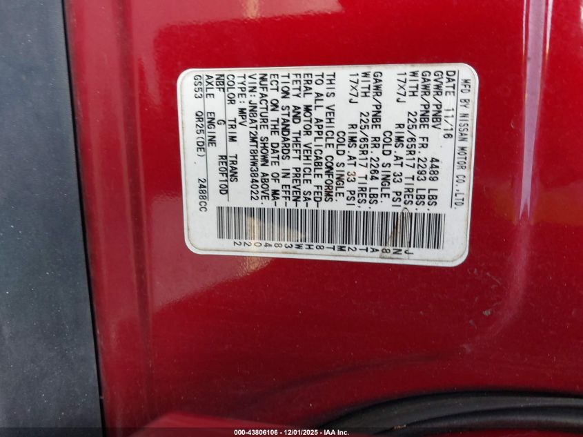 2017 NISSAN ROGUE - JN8AT2MT8HW384022, цвет - Красный, 2.5, Бензин, Передний привод из США