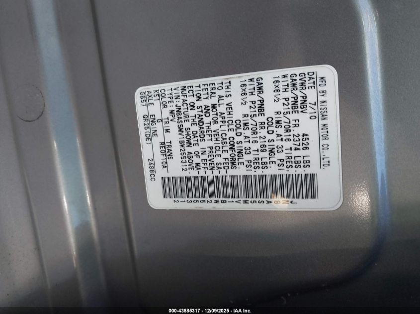 Цвет СерыйЦилиндры 4Привод Полный приводVIN JN8AS5MV1BW255312Состояние Заводится и едет (проверено)Повреждения Правая сторона