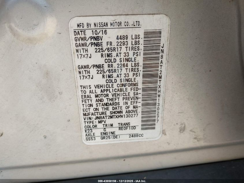 2017 NISSAN ROGUE - JN8AT2MTXHW130277, цвет - Серебряный, 2.5, Бензин, Передний привод из США