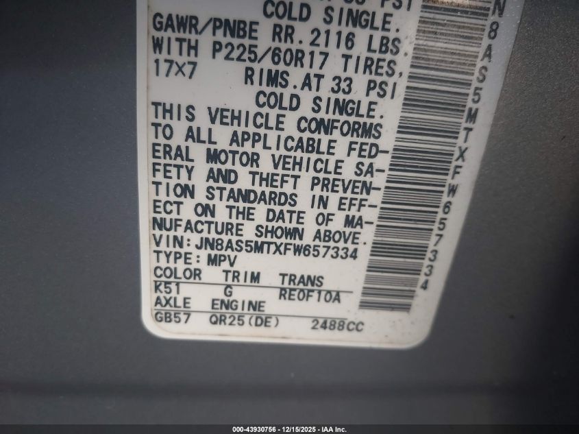 2015 NISSAN ROGUE - JN8AS5MTXFW657334, цвет - , 2.5, Бензин, Передний привод из США