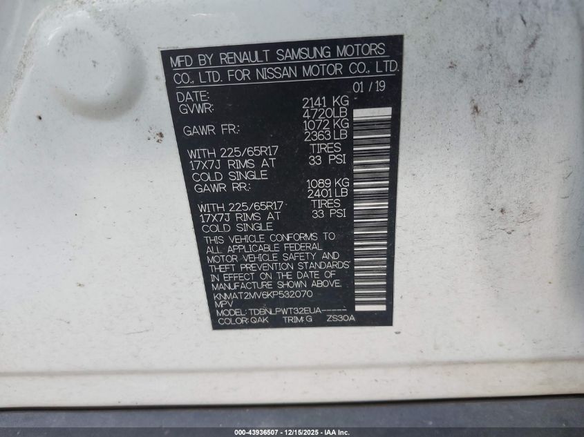 2019 NISSAN ROGUE - KNMAT2MV6KP532070, цвет - Белый, 2.5, Бензин, Полный привод из США
