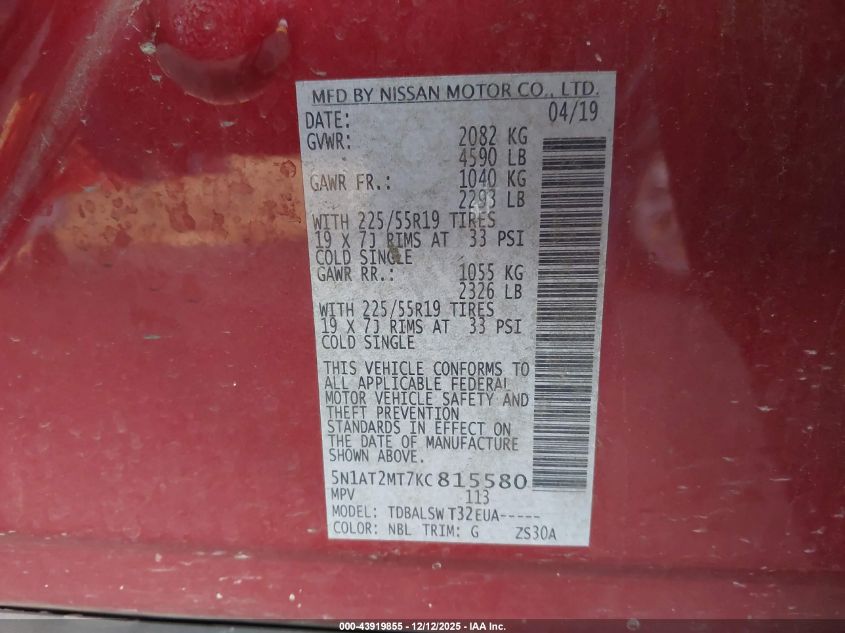 2019 NISSAN ROGUE - 5N1AT2MT7KC815580, цвет - Красный, 2.5, Бензин, Передний привод из США