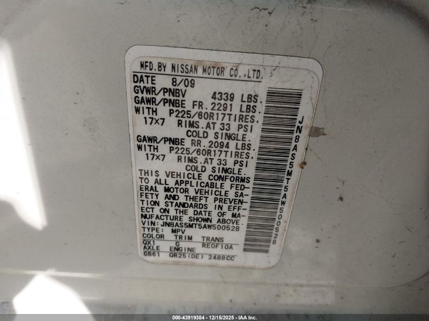 2010 NISSAN ROGUE - JN8AS5MT5AW500528, цвет - Белый, 2.5, Бензин, Передний привод из США