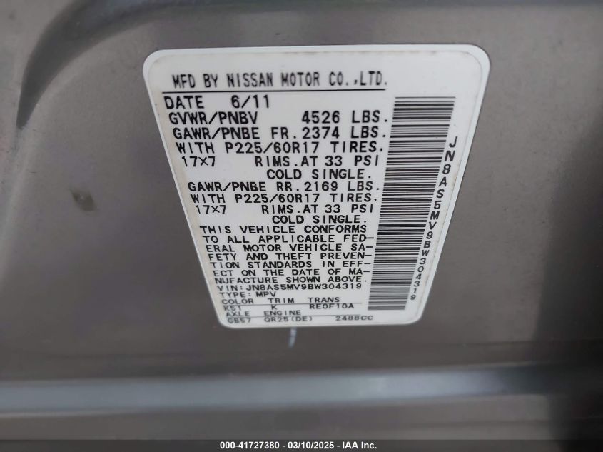 2011 NISSAN ROGUE - JN8AS5MV9BW304319, цвет - Серебряный, 2.5, Бензин, Полный привод из США