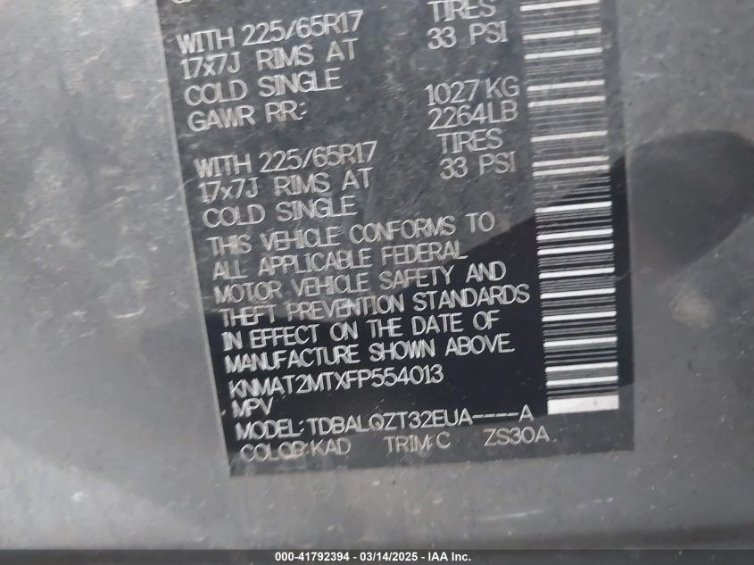 Цвет СерыйЦилиндры 4Привод Передний приводVIN KNMAT2MTXFP******Состояние НеизвестноПовреждения Левая сторона