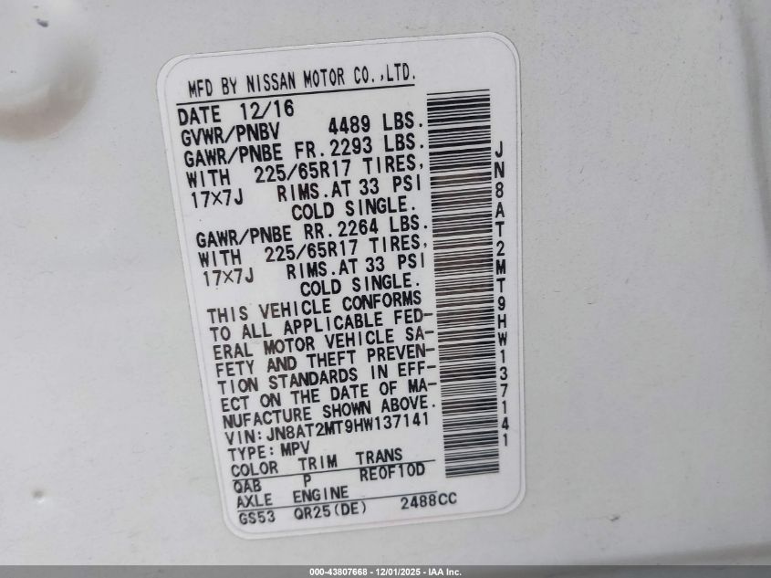 2017 NISSAN ROGUE - JN8AT2MT9HW137141, цвет - Белый, 2.5, Бензин, Передний привод из США