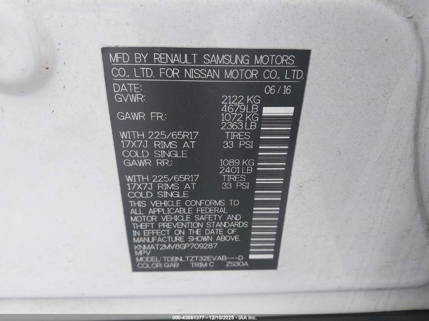 2016 NISSAN ROGUE - KNMAT2MV8GP709287, цвет - Белый, 2.5, Бензин, Полный привод из США