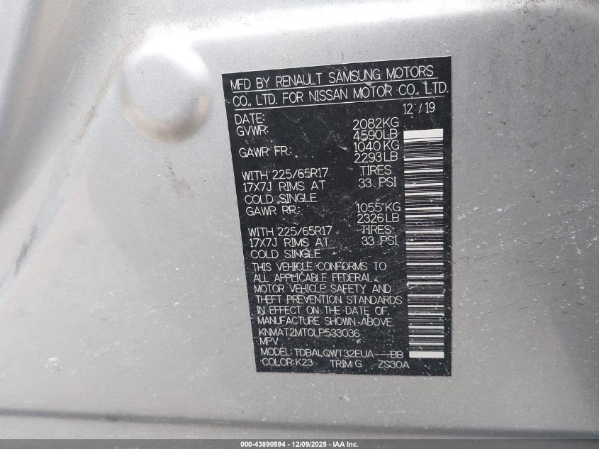 2020 NISSAN ROGUE - KNMAT2MT0LP533036, цвет - Серебряный, 2.5, Бензин, Передний привод из США