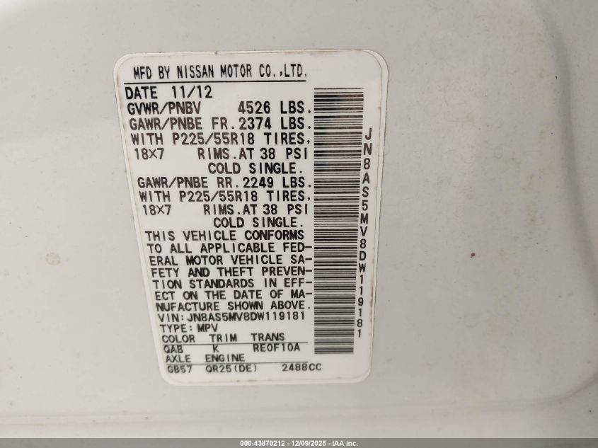 2013 NISSAN ROGUE - JN8AS5MV8DW119181, цвет - Белый, 2.5, Бензин, Полный привод из США