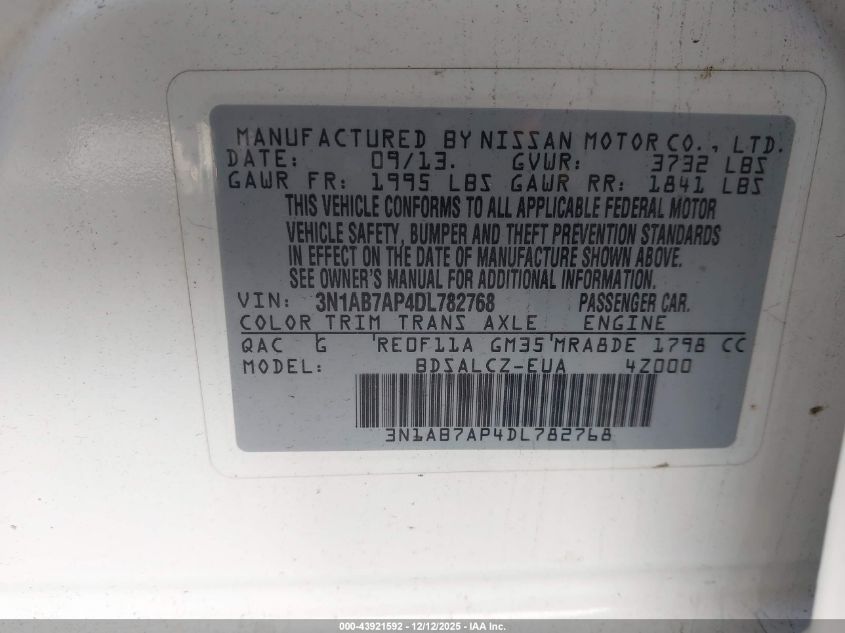 2013 NISSAN SENTRA - 3N1AB7AP4DL782768, цвет - Белый, 1.8, Бензин, Передний привод из США