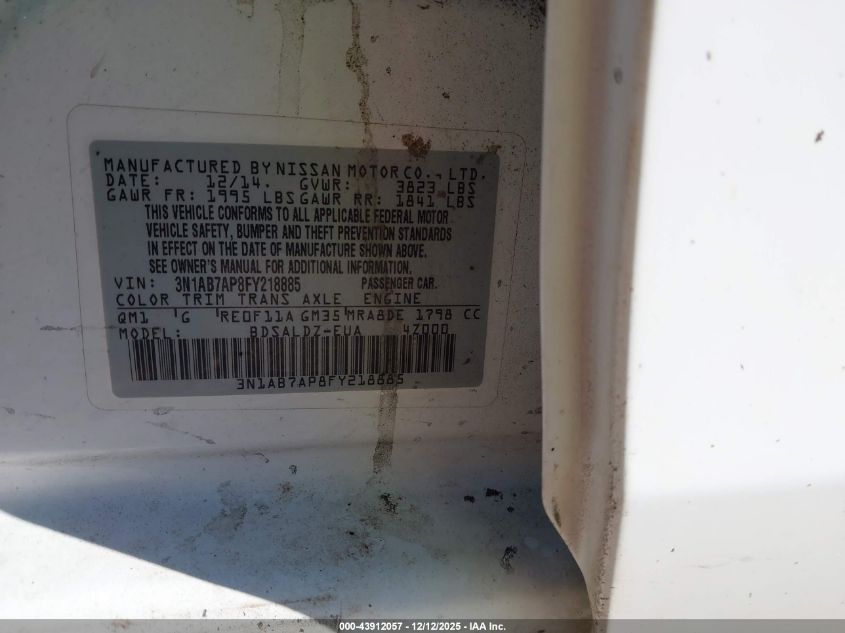 2015 NISSAN SENTRA - 3N1AB7AP8FY218885, цвет - Белый, 1.8, Бензин, Передний привод из США