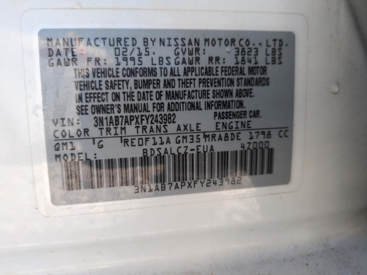2015 NISSAN SENTRA - 3N1AB7APXFY243982, цвет - Белый, 1.8, Бензин, из США