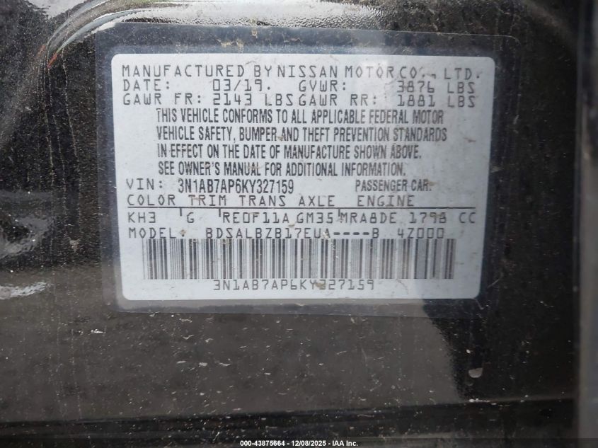 2019 NISSAN SENTRA - 3N1AB7AP6KY327159, цвет - Черный, 1.8, Бензин, Передний привод из США