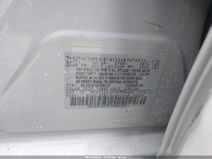 2019 NISSAN SENTRA - 3N1AB7AP9KY280127, цвет - Серебряный, 1.8, Бензин, Передний привод из США