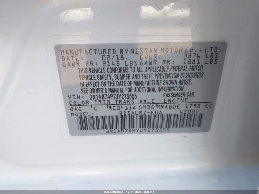 2018 NISSAN SENTRA - 3N1AB7AP7JY275555, цвет - Белый, 1.8, Бензин, Передний привод из США