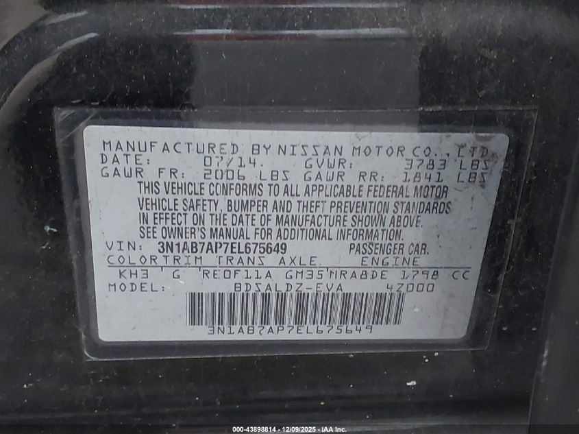 2014 NISSAN SENTRA - 3N1AB7AP7EL675649, цвет - Черный, 1.8, Бензин, Передний привод из США